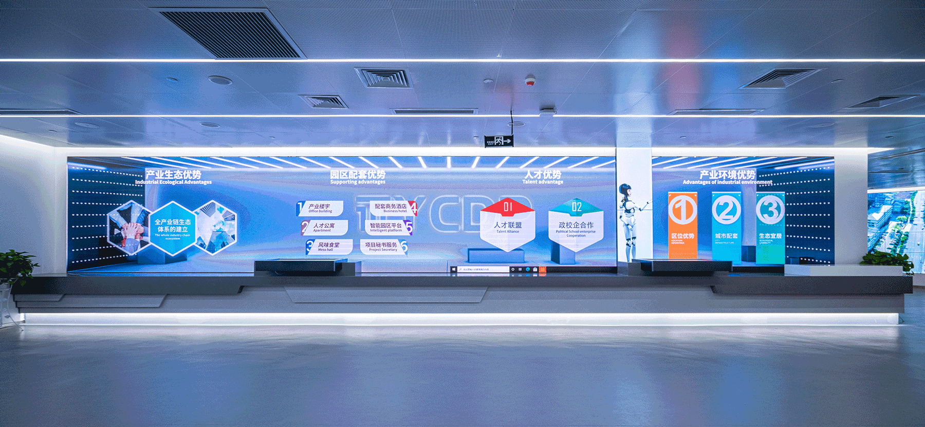 隨著大數據與云計算、5G通信網絡、網絡信息安全產品和服務等新一代信息技術的快速發展,人們的生活方式以及商業的運作模式都悄然改變。借著國家政策扶持的東風,各地大數據產業園應運而生。 金螳螂文化匠心出品重慶永川大數據產業園、鄭州天健湖大數據產業園等主題展廳,通過創新設計,全方位展示大數據項目的運用場景及產業園孵化能力,為引育創新人才、融通創新資本帶來更多可能。 永川大數據產業園 ······● — 重慶市 — ●······ 云谷·永川大數據展示中心位于重慶市永川區大數據產業園C區,1000多平方米的展陳空間內,智慧城市、服務公社、AI、智行天下—雙城智能網聯經濟走廊、云上橫店—全國先進影像制作基地、數字孿生城市—城市數字化管理平臺、西部數據處理基地等區內大數據產業匯聚于此。 大數據產業園將以科技驅動變革為契機,助力永川打造新經濟增長點。 追夢未來 大數據的無限可能 — Infinite Possibilities of Big Data — 展廳以“智慧永川·數據云谷”為主題,整體空間分為云端·智慧永川、沃土·助夢揚帆、征程·銘記芳華、產業·云劃未來、愿景·云端萬象五大板塊,展示產業園以服務外包為基礎,軟件信息、數據處理、數字內容、電子商務融合發展的五大產業集群。 展館采用現代簡約風,將像素和數據流的概念融入空間。展品與傳統形式區分開,利用聲、光、電等多種表現手法,通過互動體驗吸引參觀者的注意力。展項內容靈活可變,能夠隨大數據的發展與變化持續更新。 虛擬主持人--產業園風貌總覽 運用達瓦的動態捕捉和人臉捕捉技術,構建以真人面部和機械軀干合成的虛擬主持人;通過多媒體電子屏幕與模塊芯片上下聯動,詳細介紹永川大數據產業園便捷交通、宜居宜業、人才資源豐富等多元化優勢。 莫比烏斯環--大數據川流不息 以“莫比烏斯環”作為基礎外形,以數字化循環流動的影像構建藝術裝置,進入展示主題”讓大數據永遠川流不息”。墻面光效與莫比烏斯環畫面聯動,使參觀者在如夢似幻的氛圍中感受大數據的魅力。 天健湖智聯網產業園 ······● — 鄭州市 — ●······ 天健湖智聯網產業園位于鄭州市高新技術開發區,以國家數字經濟戰略為指導,構建以智能物聯網為核心,以人工智能、大數據、5G、區塊鏈、云計算為支撐的“1+5+N產業生態體系”,賦能政務、工業、交通、醫療、農業、能源、教育等各個領域,建設高品質生態智慧園區。 展示中心位于產業園北地塊東北角,建筑面積約3000平方米,是一座集展示、體驗于一體的現代科技展館。 賦能中原 點亮數據新未來 — ARTIFICIAL INTELLIGENCE — 天健湖智聯網產業園展示中心分為產業高新、產業宏圖、產業融合、數據宏圖等板塊,配套有路演廳、會議室等共享空間。 SPACE DESIGN 展廳設計之初,金螳螂文化的設計團隊充分解讀建筑設計語言,依據建筑螺旋式形態進行展示布局劃分,解決了異形形態建筑柱子過多、影響參觀流線的難題。將建筑中“力”的匯聚點與展陳內容的“核”——數字沙盤匯聚于一點,形成“數據之眼”。 源于對設計品質與落地效果的不懈追求,由金螳螂文化打造的天健湖智聯網產業園展示中心項目獲得中國建筑裝飾協會“2020年度建筑裝飾行業科學技術獎——設計創新獎”。 LED星云數據水流幕、超大球幕演繹、數字沙盤秀場、飛屏聯動講解系統、全沉浸式未來影院……通過亮點展項的演繹,串聯起流暢的參觀路線,給參觀者直觀的智能體驗,感受產業園“賦能中原 數創未來”的初心。