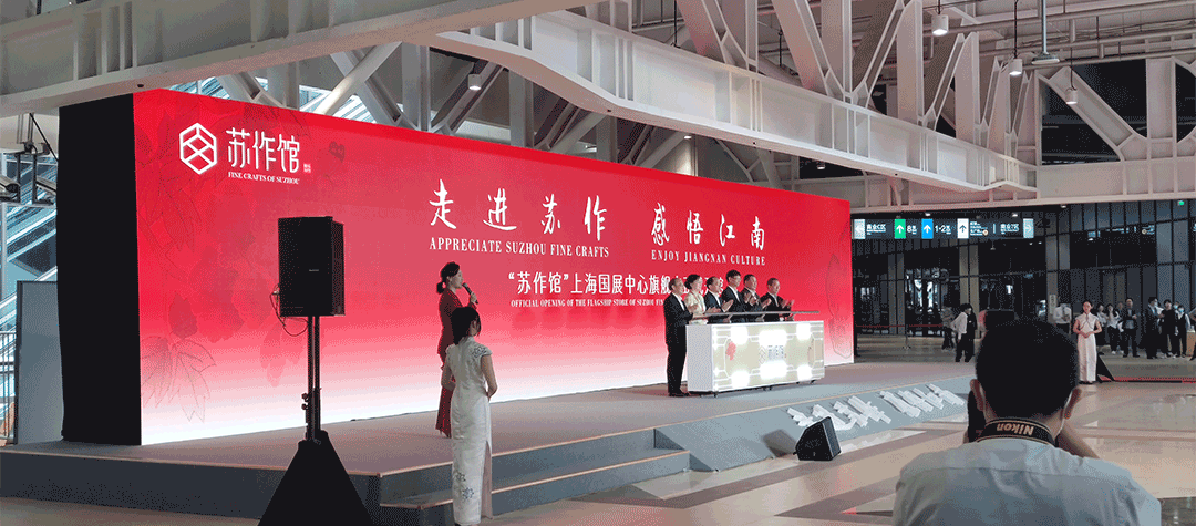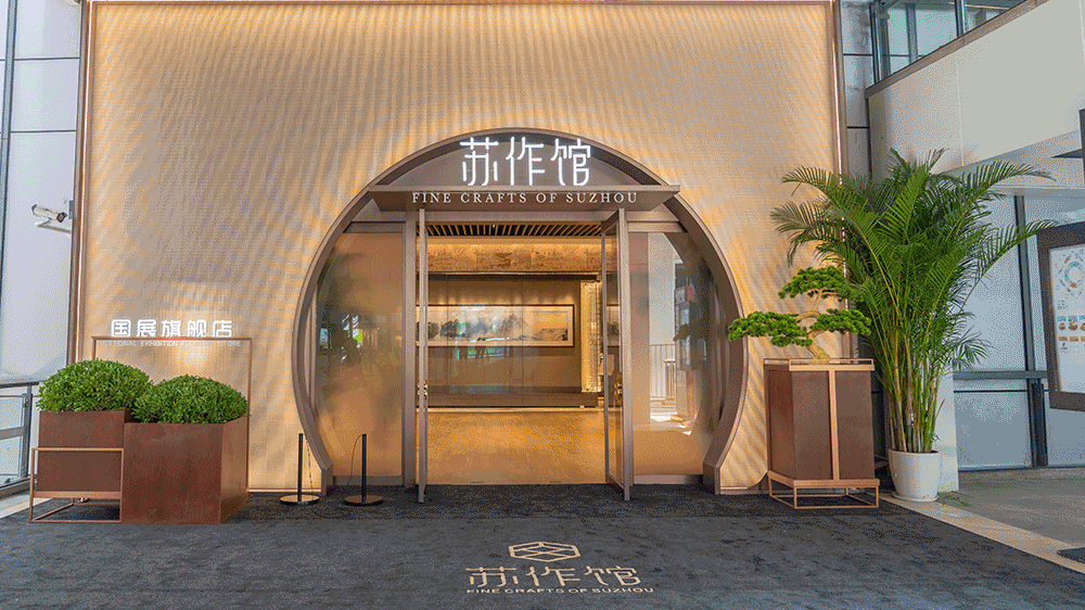 “蘇作館”坐落于上海國家會展中心,場館面積1200平米,歷時五個月精心打造。館內規劃設計有蘇宮區、大師精品區、大師衍生品區、蘇工蘇作演藝區、直播間等功能區